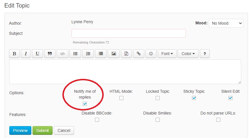 If you are posting a new topic and want to be notified by email when there are replies / comments on it, simply check the "Notify me of replies" box in the options above the Preview and Submit buttons.